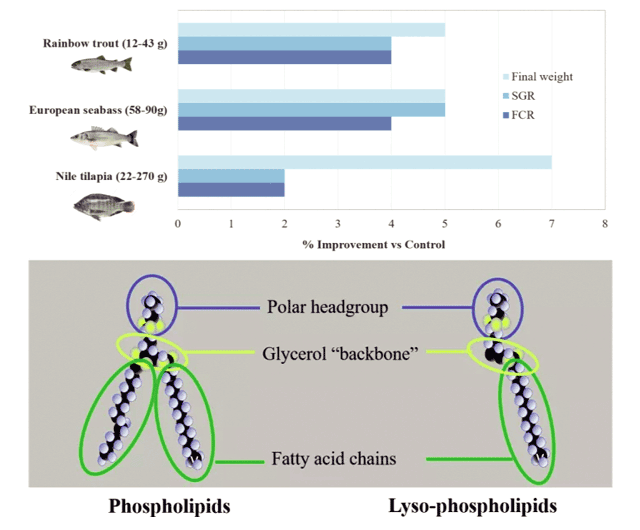 Việc bổ sung 0,1% lyso-phospholipid có tên thương mại là Aqualyso trong 75 ngày vào trong thức ăn của cá chẽm châu Âu với 16% protein từ bột cá và còn lại là protein thực vật đã giúp cải thiện 5% tỷ lệ tăng trưởng cụ thể (SGR%/ngày) và giảm 4% tỷ lệ chuyển đổi thức ăn (FCR) so nhóm đối chứng (Hình bên). Trong khi đó, khi bổ sung 0,2% Aqualyso trong 56 ngày vào trong thức ăn của cá hồi vân với hàm lượng protein từ bột cá là 15%, 30% bột đậu tương cũng đã cho kết quả tương tự là cải thiện 5% SGR và giảm 4% FCR. Hiệu quả cũng đã được chứng thực với cá rô phi giống khi bổ sung 0,1% Aqualyso trong 75 ngày cũng cải thiện đến 7% SGR và giảm 2% FCR.