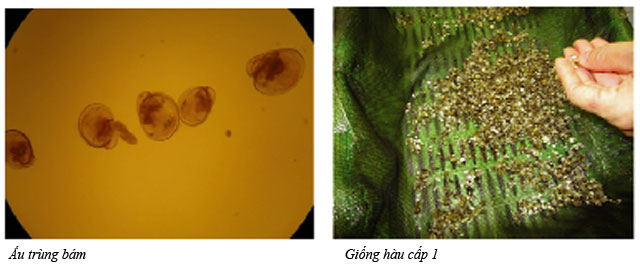 - Quy mô sinh sản thử nghiệm cho mỗi đợt/đối tượng: 100 con hàu mẹ, số lượng ấu trùng đưa vào bố trí thí nghiệm là 30 triệu con. Mật độ ương ấu trùng chữ D là 10 con/ml; ương ấu trùng bám là 5 con/ml và ương lên giống cấp 1 là 1 con/ml.
